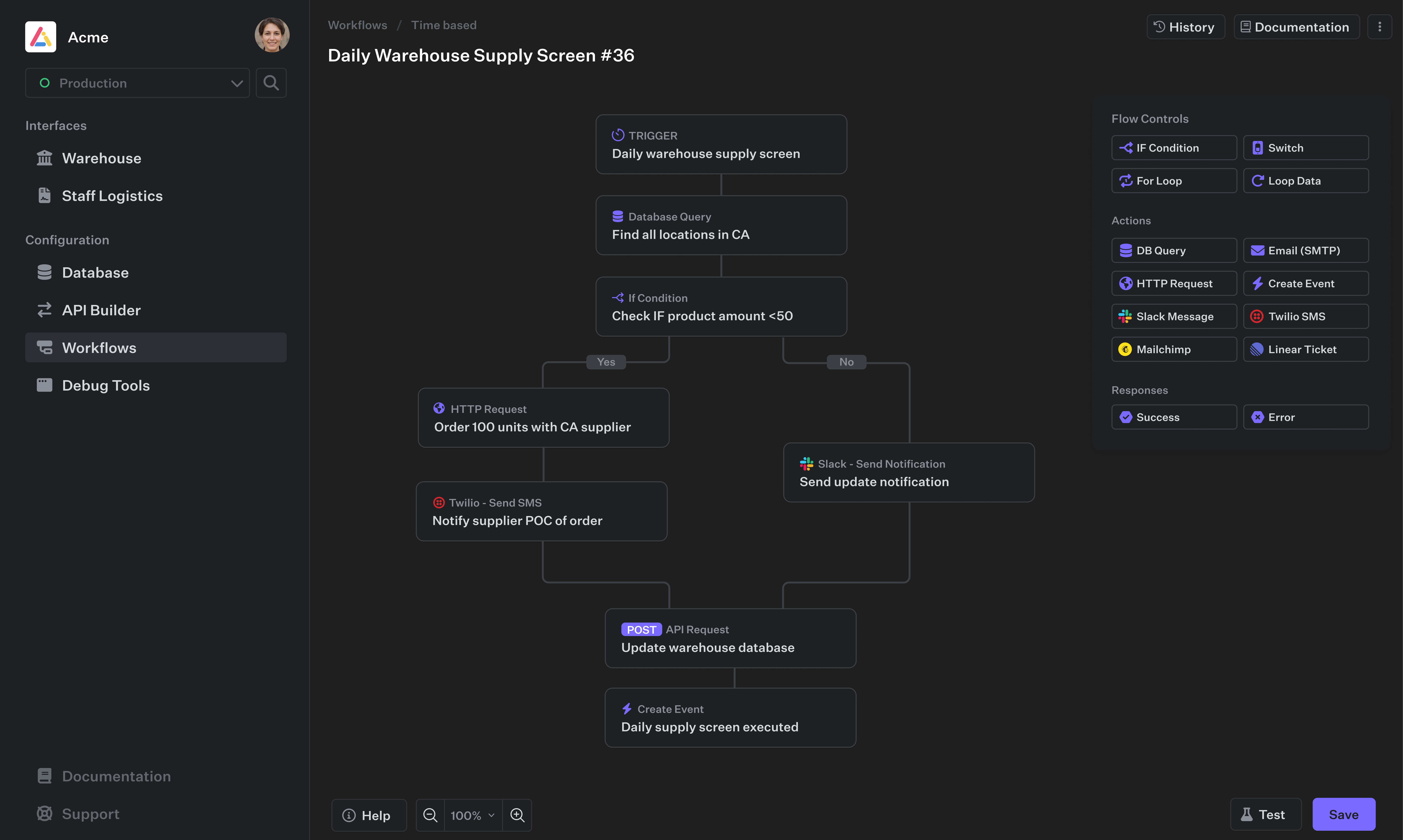 Build your product logic and workfows in one interface by connecting any service and function you need.