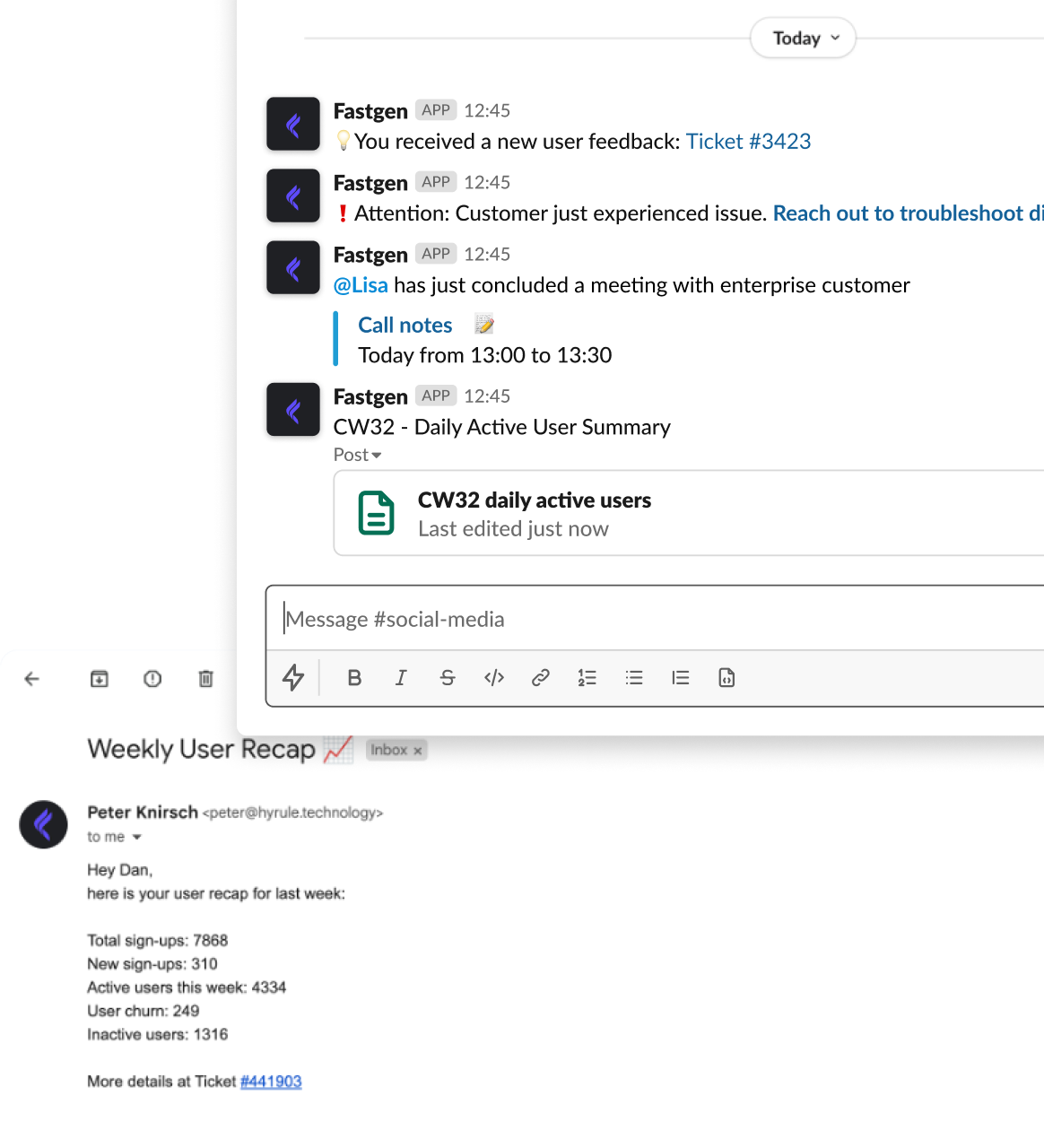 Get notified about new leads, churn, daily operations or anything else that is happening. Connect your DB or third party service.